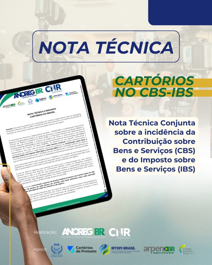 Está disponível a Nota Técnica Conjunta da Associação dos Notários e Registradores do Brasil (ANOREG/BR), da Confederação Nacional de Notários e Registradores (CNR) e dos Institutos Membros com orientações aos notários e registradores sobre as obrigações acessórias relativas à CBS e ao IBS, a emissão de nota fiscal eletrônica e os impactos do período de transição do novo sistema tributário sobre a atividade notarial e de registro.