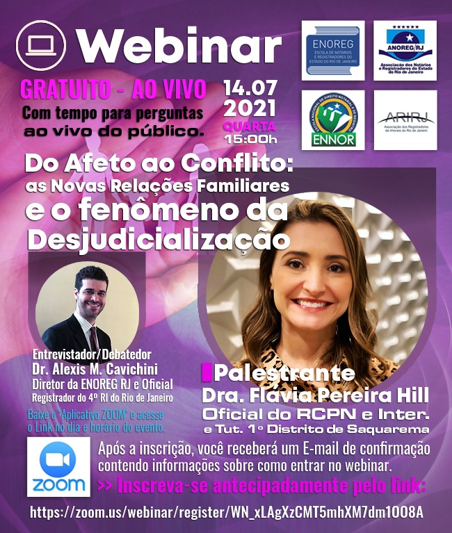 No dia 14 de julho, às 15h, teremos o próximo Webinar da ENOREG RJ sobre RCPN e direito de família – Do afeto ao conflito: as novas relações familiares e o fenômeno da Desjudicialização, em que o Dr. Alexis Mendonça Cavichini Teixeira de Siqueira entrevistará a Dra. Flávia Pereira Hill.